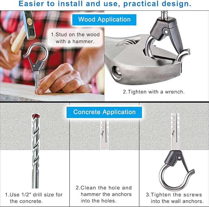 • 【Easy Installation】Wall Mount Ceiling Hooks are quick and easy to install.You can tap directly into the wood with a hammer or screw into the wood with a wrench. Contains four Enter the wall to expand the colloidal particles, which can be installed on concrete ceilings or walls.