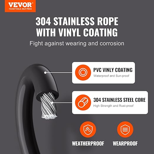 • Premium Quality Material: Our wire rope is made of 304 stainless steel, which is hard-wearing and can withstand severe weather. Vinyl coating enhanced the resistance to water and other corrosion, which ensures durability and longevity.