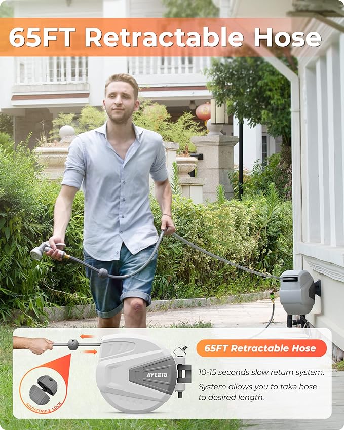 Ayleid Retractable Garden Hose Reel,1/2 in x 65 ft Wall Mounted Hose Reel, with 9- Function Sprayer Nozzle, Any Length Lock/Slow Return System/Wall Mounted/180°Swivel Bracket (Grey)