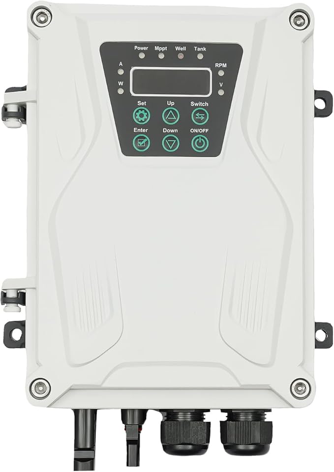 • 【MPPT CONTROLLER】The solar water pump controller drives the high efficient brush-less DC pump motor, utilizing the latest MPPT technology to ensure maximum flow is delivered under all light conditions. It also protects the submersible pump from frequent start up in low light conditions, overheating and running dry.