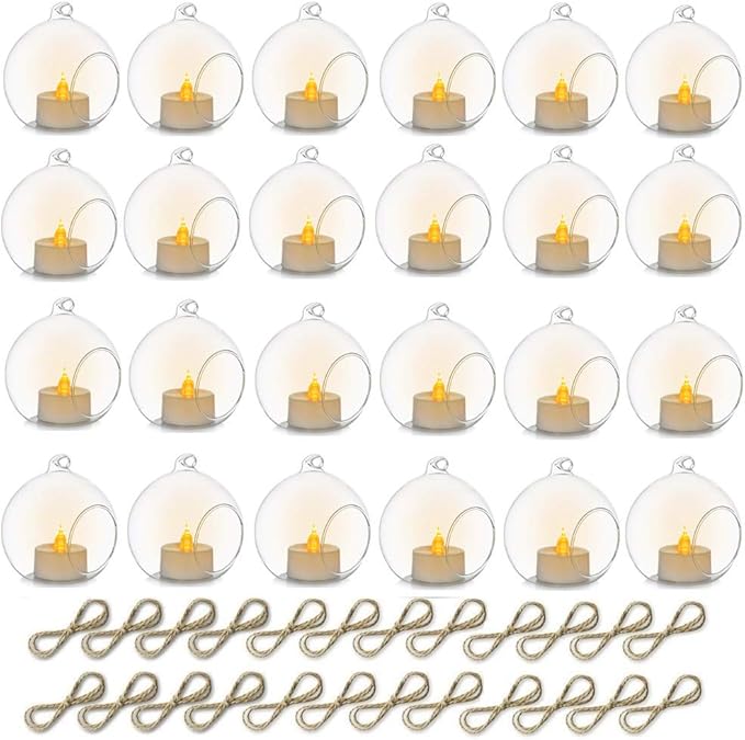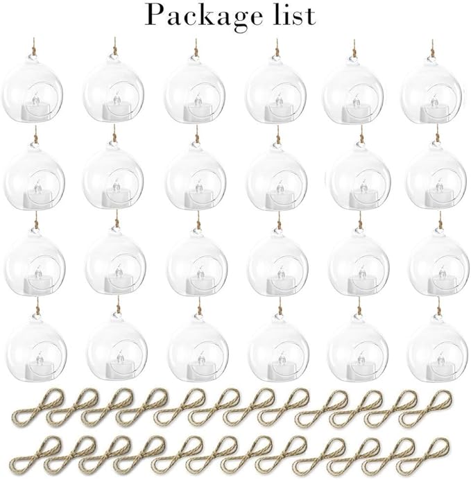 • Package Includes: You will receive 24 Pcs candle holder ,24 Pcs LED tealight candle and 24 x 3.28 Ft jute twine strings. Candles are included. It will be a perfect match to use this glass ball with LED candle.