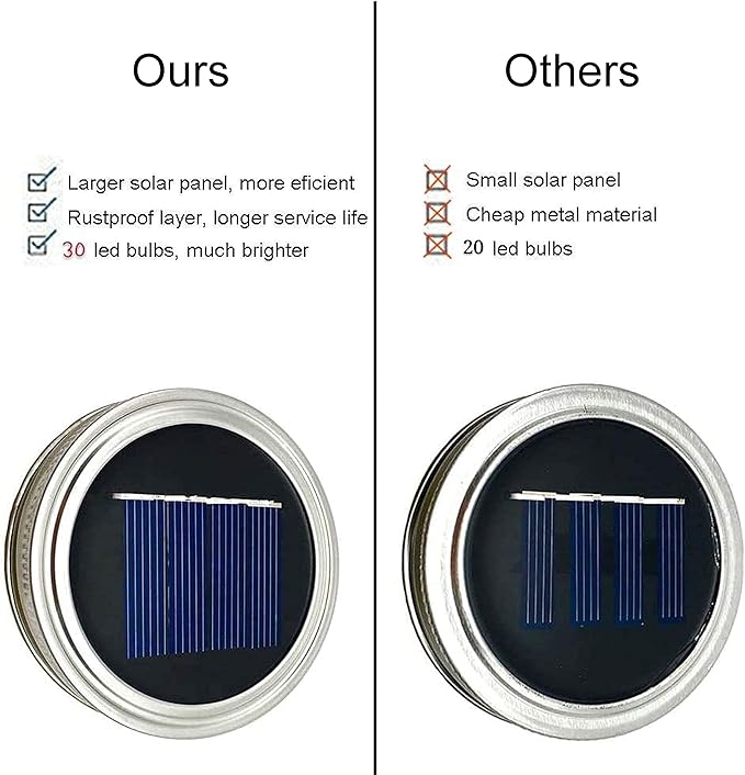 • ♔UPGRADED MASON JAR LID LIGHTS: With 30 micro LED, much brighter than those 20 LED jar lights. Larger solar panel, charge more efficiently. The edge of the lid uses rustproof material instead of cheap alloy, you would find it more durable in humid weather.
