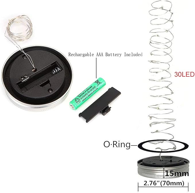 • ♔SPECIFICATIONS: Gorgeous copper wire with 30 bright bulbs can make your surrounding pretty romantic.Fits for most regular mouth mason canning jars, lid diameter size: 2.76 inches (70 mm) / insert 2.17 inches (55 mm).