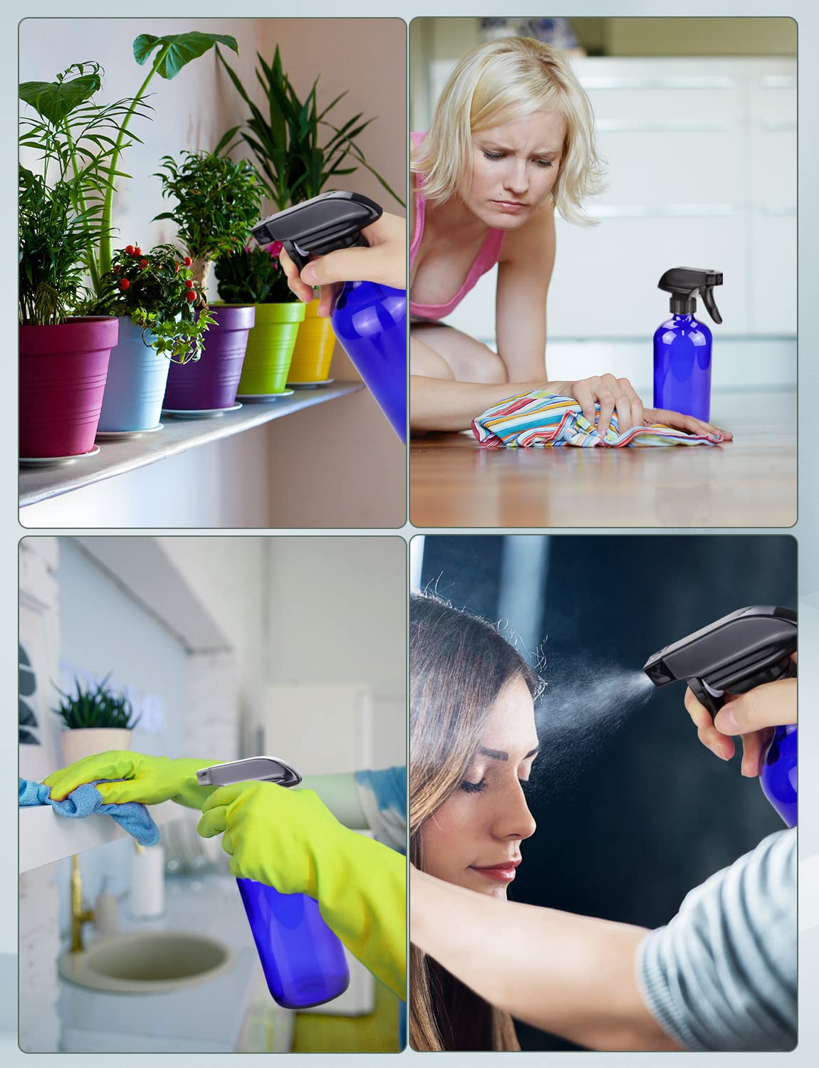 • Multifunctional: The glass bottles can fill with whatever liquid you want. Perfect for homemade cleaning solutions, hair moisturizing spray, floor or carpet cleaner, kitchen cleaner, spraying plants, pet spray, ironing, window cleaners and so on.