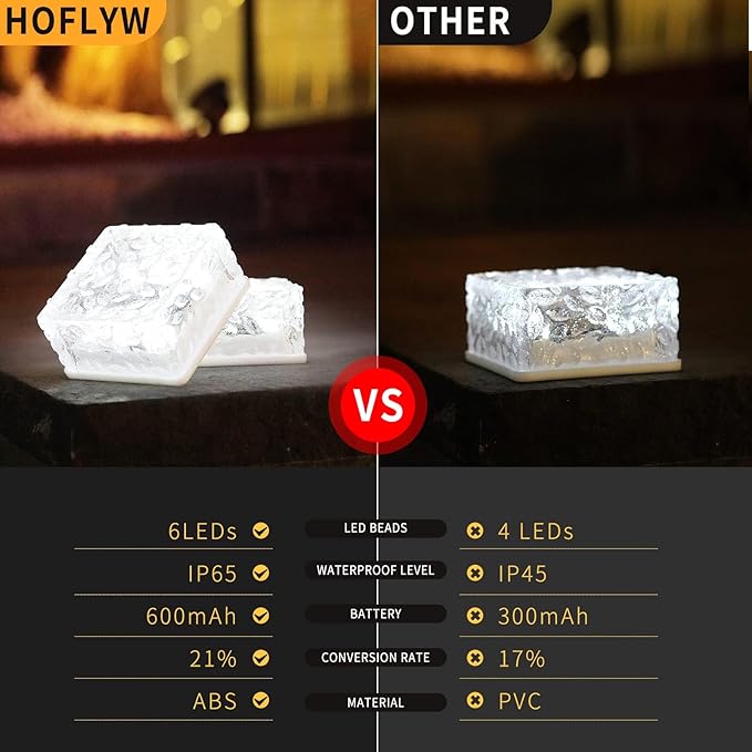 • Outdoor lights: Lncrease battery capacity Outdoor Solar Lights Compared to similar products with a 300mAh battery, our solar brick lights feature a larger 600mAh battery, providing a longer-lasting illumination. Additionally, they come equipped with a larger solar panel ,With just around 4 hours of sunlight during the day they'll illuminate your nights