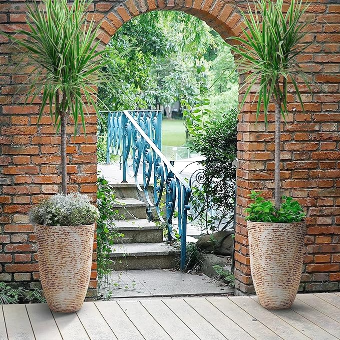 • Classic Appearance: Its curved silhouette and raised details offer up a touch of classic character, while a solid matte finish with grain texture updates the look; These tall tree planter is an ideal for a patio accent or flanked along an entrance wall; Gives your tall plants a tall planter! Size:14'' (Dia.) x 20.5'' (H.)