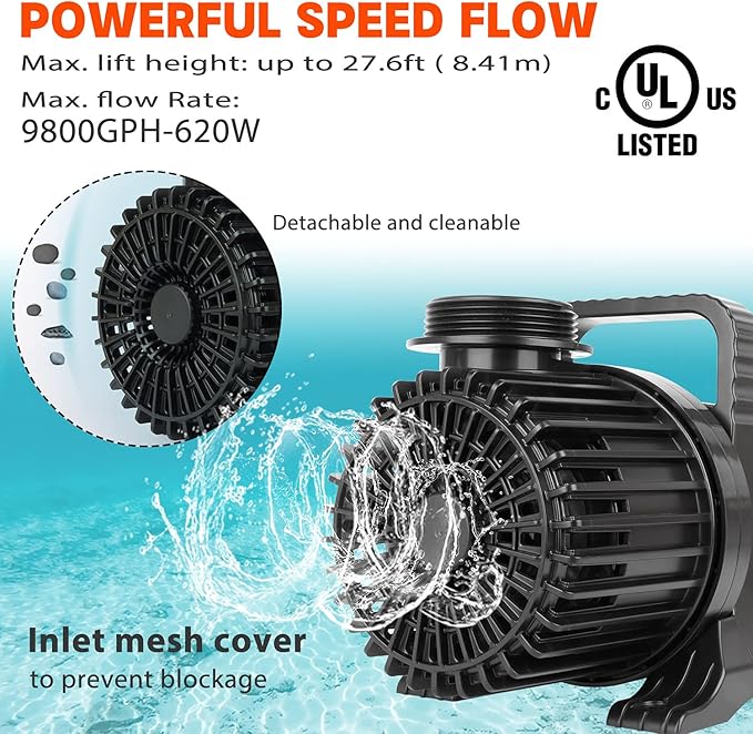 • ULTRA QUIET & OVER-HEAT PROTECTION - Our pond pump is designed to be nearly silent. It features a unique inlet mesh cover that prevents garbage suction as well and reduces motor sounds, ensuring your water bodies are quietly circulated and maintained.Engineered for twenty four hour continuous use, while a heat-overload sensor prevents a burnout