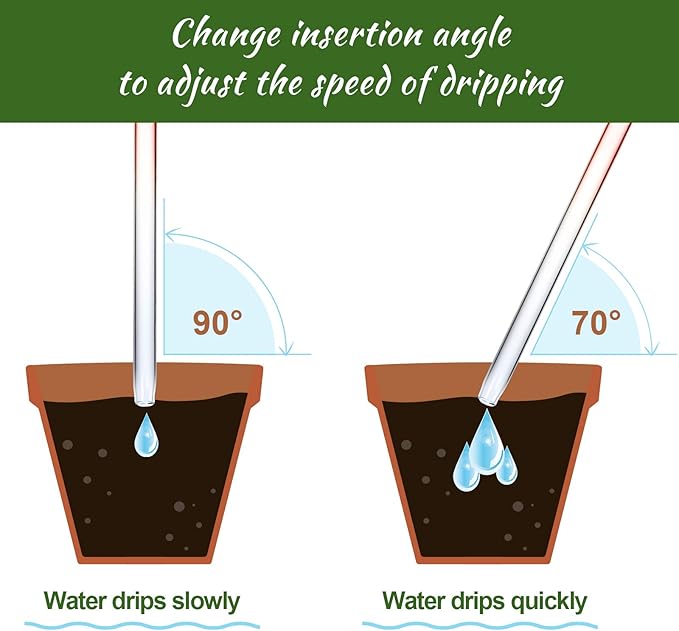 • 🌷【Mini Irrigation System】The draining speed of water depends on various factors, including the type of soil in the pot, the amount of water the plant needs, the ambient temperature, etc. Change the insert angle to adjust the rate of emptying and water the plant thoroughly before using the waterer to prevent it from emptying more quickly than expected. Overall Length: 10.2”, Water Reservoir Storage Capacity: 95mL.