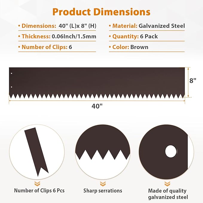 • Enhancement Kit - Each set includes 6 steel edges, measuring 40 inches (length) x 8 inches (width), and 6 clips for efficient installation. Experience the convenience and quality of our steel garden edges, adding brilliance and color to your landscape project