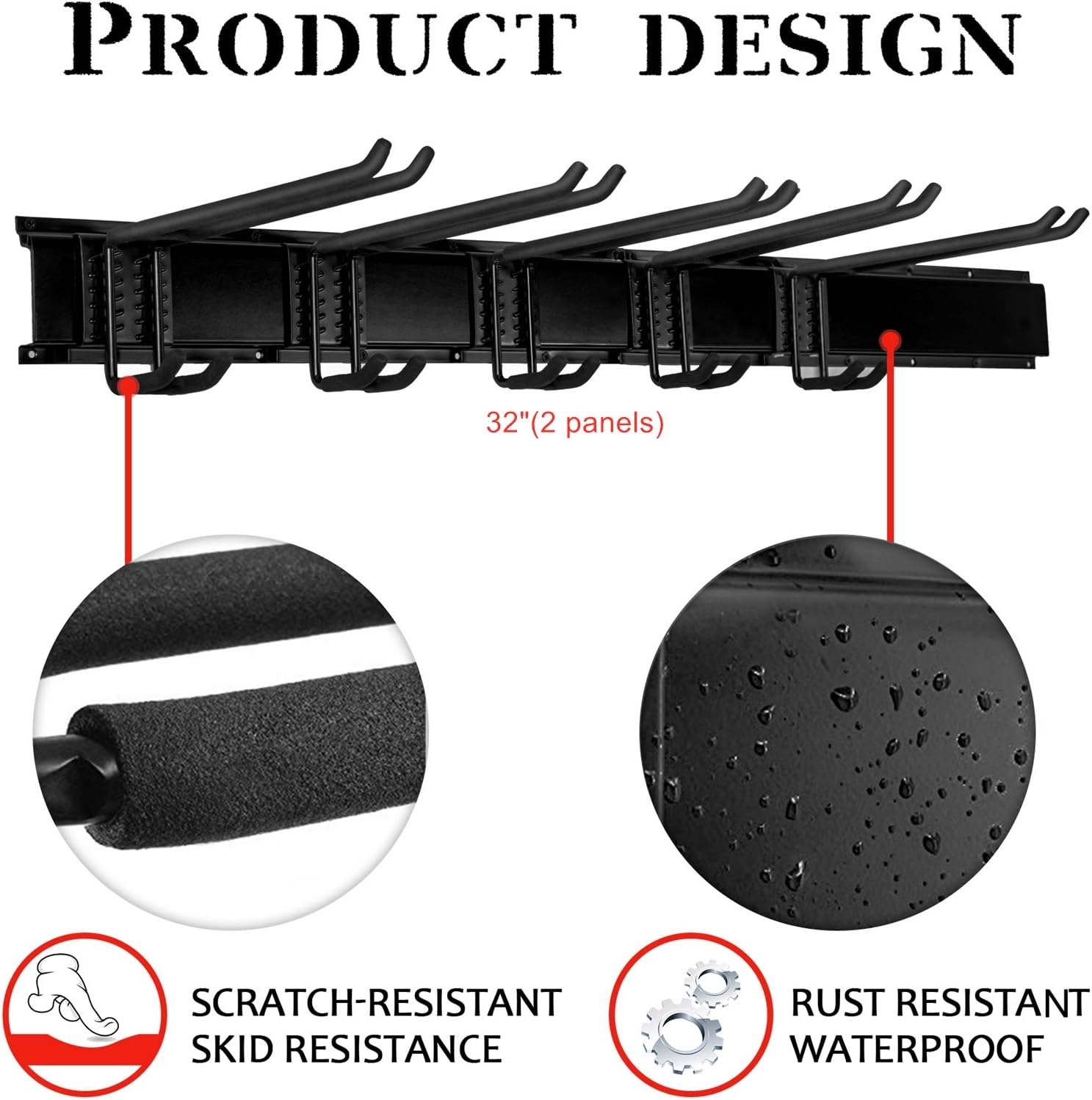 • Adjustable Rubber-coated Hooks: The hooks of the garden tool organizer for garage are rubber-coated (will not scratch the tool handles) and removable, you can customize the spacing between the attachments on the 32" steel rail (2 panels) to meet your needs. Its ease of adjustability makes it quite dynamic if your tool storage needs a change