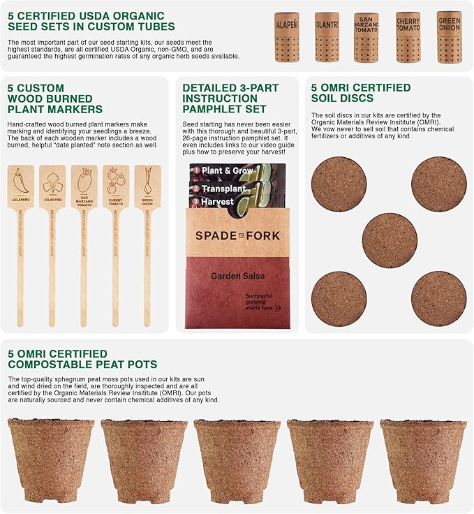 • Spade To Fork Kits - Our company is family owned and operated right here on our 65 acre farm in rural Oregon. Each Spade To Fork indoor growing system set contains 5 types of Certified USDA Organic Non GMO seeds, including San Marzano Tomato + Early Cherry Tomato + Early Jalapeño + Cilantro (slow bolt) + Green Onion Seeds ; 5 OMRI certified compostable peat pots; 5 OMRI certified rich potting soil discs; 5 custom wood burned plant markers; our beautiful and helpful 26pg growing guide