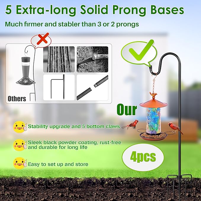 XDW-GIFTS Bird Feeder Pole for Outdoor, 4-Pack 45 Inch Shepherds Hooks Heavy Duty Garden Pole for Hanging Plant Basket, Solar Light Lanterns, Garden Plant Hanger Stands with 5 Base Prongs