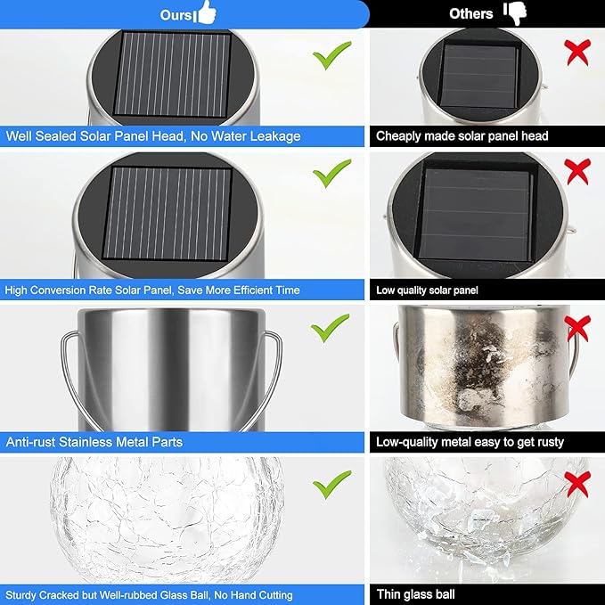 • 【Waterproof & High Quality】-Made of sturdy glass and stainless steel, these solar globe lights outdoor stay under the sun, rain, snow, ice and wind, or even in the worst weather conditions. Combines with the well-sealed solar panel craft, these outdoor solar lantern with a strong waterproof function, you have no need to worry water leakage or frequent replacement. Non-toxic & environment friendly materials, do no harm to your health.