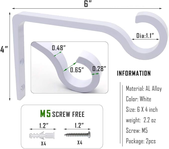• 【EASY TO INSTALL】This package includes 2 plant hooks, 4 screws and 4 wall anchors, and maximum load up to 22 lb. Each screw is a standard M5 screw, 1.2 inches long. All you have to do is screw the screws into the wooden fence posts, deck posts and even the interior walls. It looks great in a variety of different environments.