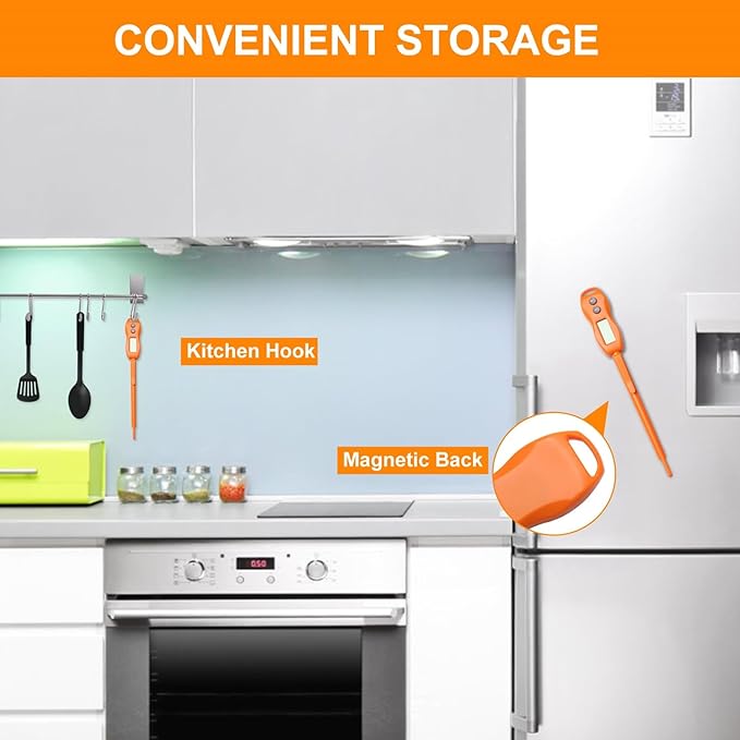 • [Easy to use] Simply insert probe into your food or liquid and wait for 2-3 seconds until final temperature is displayed; Built-in Magnet; IP66 Rated Waterproof; Probe length is 5.2 Inches