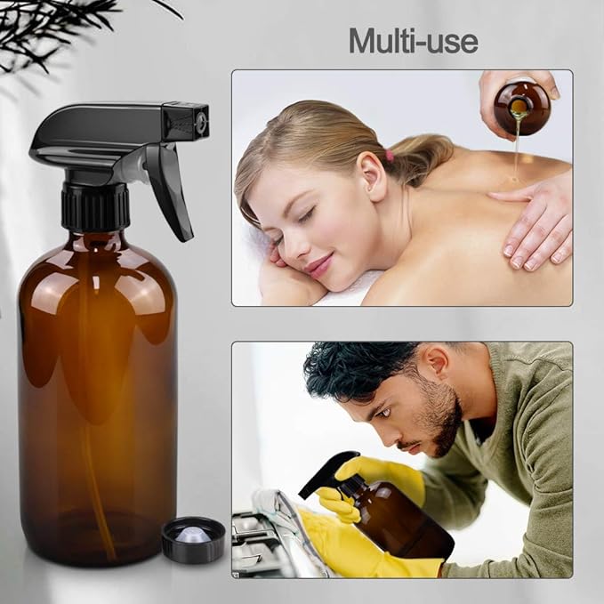 Glass Spray Bottles, 16oz Refillable Containers, Empty Boston Round Bottles with Labels & Adjustable Nozzle for Cleaning, Gardening, Aromatherapy, Pets, Plant, Hair -Amber (2 Pack)