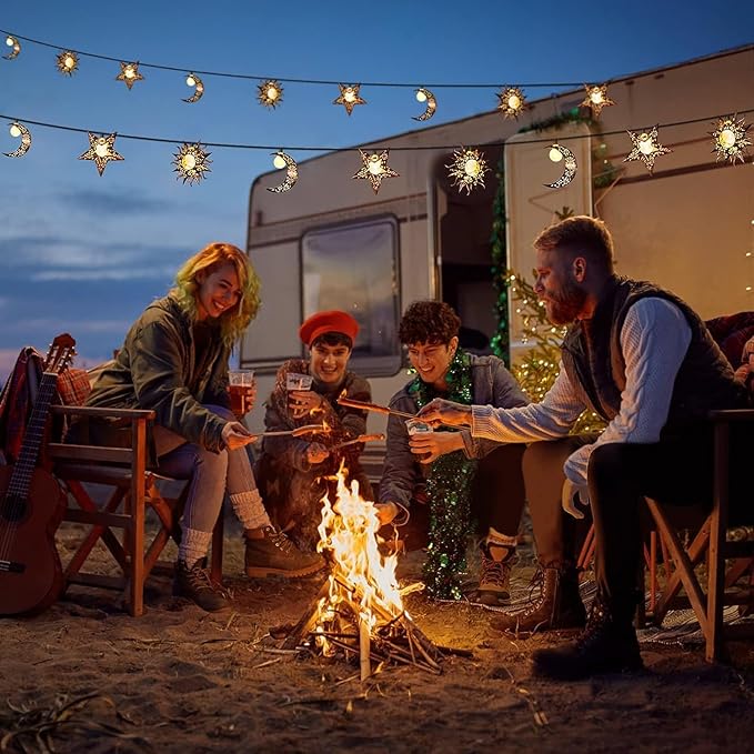 • 【Unique String Lights Designed Concept】Exclusive Copyright, Intellectual Property Protection. These classic 9 sun moon star pieces solar string light size: 6.5ft lead cable and Length between 2 star(3.9inch) .Two modes to choose: can be switched into flashing or steady mode.