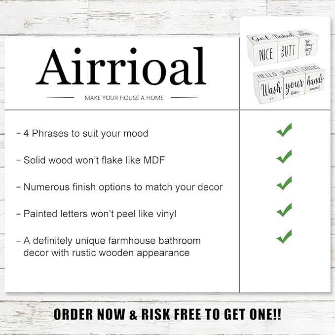 • 【FOUR-SIDED FUNNY SIGNS】- Printed with four-sided funny signs, Get naked, Nice Butt, Hello Sweet Cheeks and Wash Your Hands.The farmhouse rustic blocks decor is in unique design that could bring funny and relaxing feeling for room atmosphere. A good way to make the first-visiting guest laugh happily, thinking that you were cheerful and outgoing, feeling relaxed and getting closer.