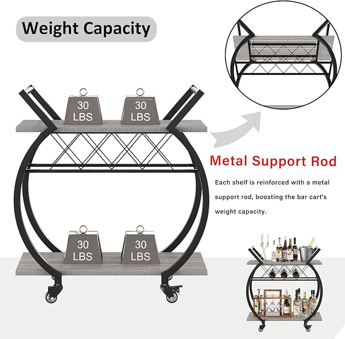 LVB Bar Cart with Wine Rack, 2 Tier Farmhouse Kitchen Cart on Wheels, Modern Wood and Metal Portable Coffee Cart Table for Home, Utility Industrial Mobile Serving Cart with Storage Shelf, Grey Oak