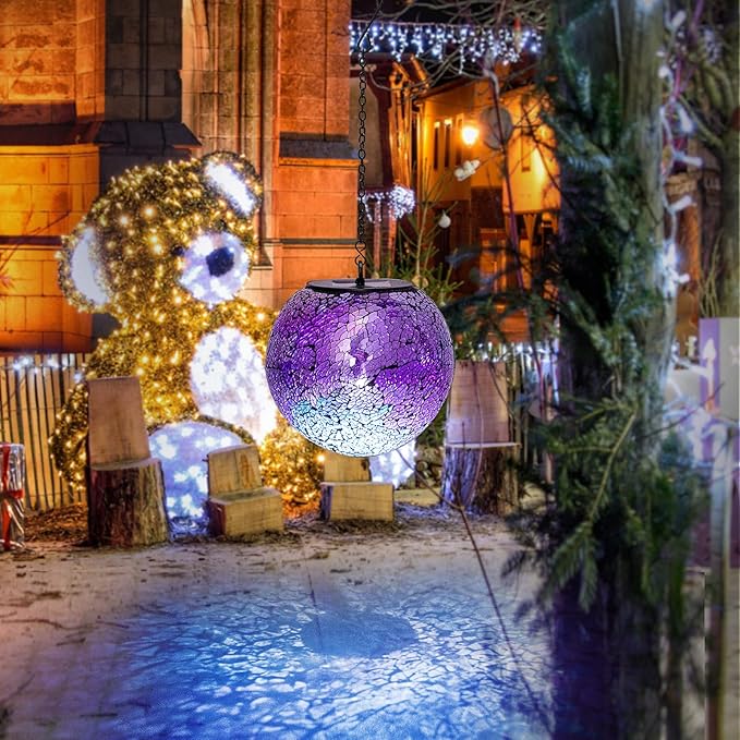 • 【Various Decoration Styles】Solar lights outdoor garden features a glass mosaic construction; Hangs from a sturdy metal chain; Add elegance and color to your backyard, patio, porch, front yard, deck