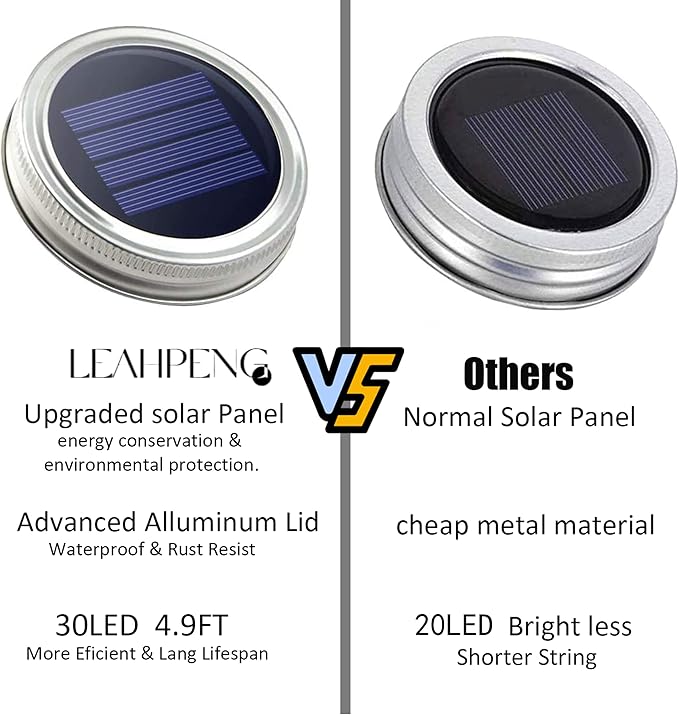 • ✨Mason Jar Lights - SmilingTown’s New Upgraded 10 Pack 30 LED solar mason jar Lids string Lights ,lights up more effective and Fits for most regular mouth mason jar,Decoration for weeding, patio,garden, party,photograph. (10 Hangers Included but Jar Not Included)