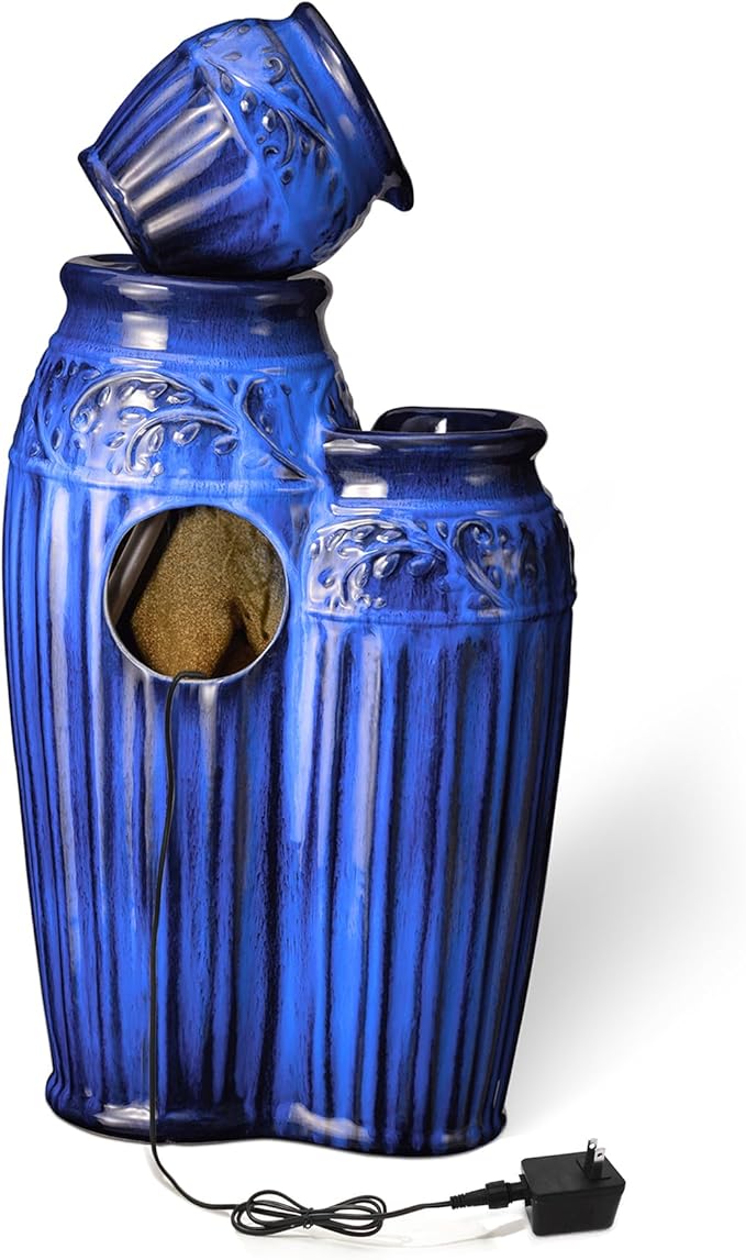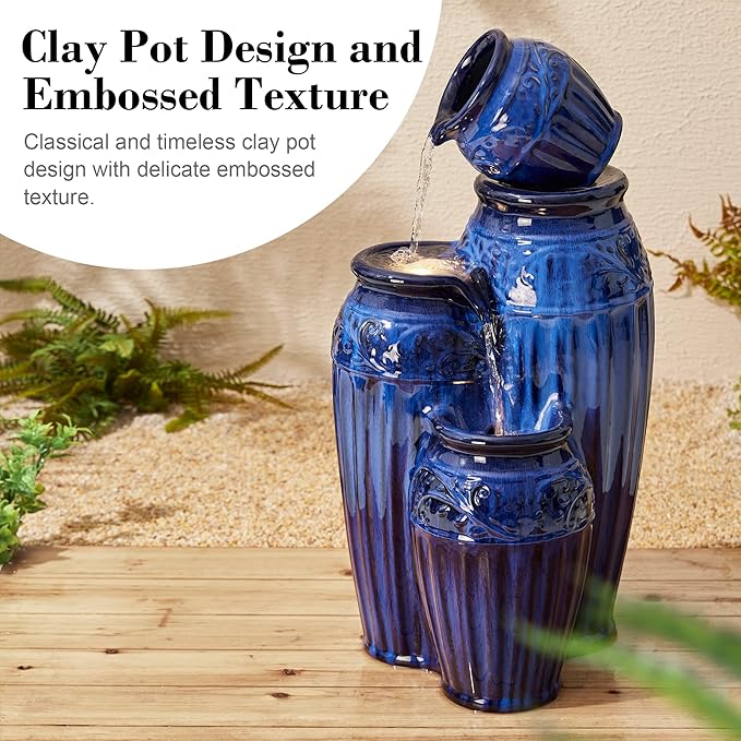 • Elegant 4-Tier Classic Design --- Featuring a classic, clay pot silhouette adorned with delicate embossed textures, this Ceramic Cobalt Blue Fountain exudes vintage charm. The striking kiln-fired cobalt blue glaze adds an elegant touch, while warm white LED lights in the two lower pots create a magical ambiance.