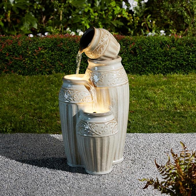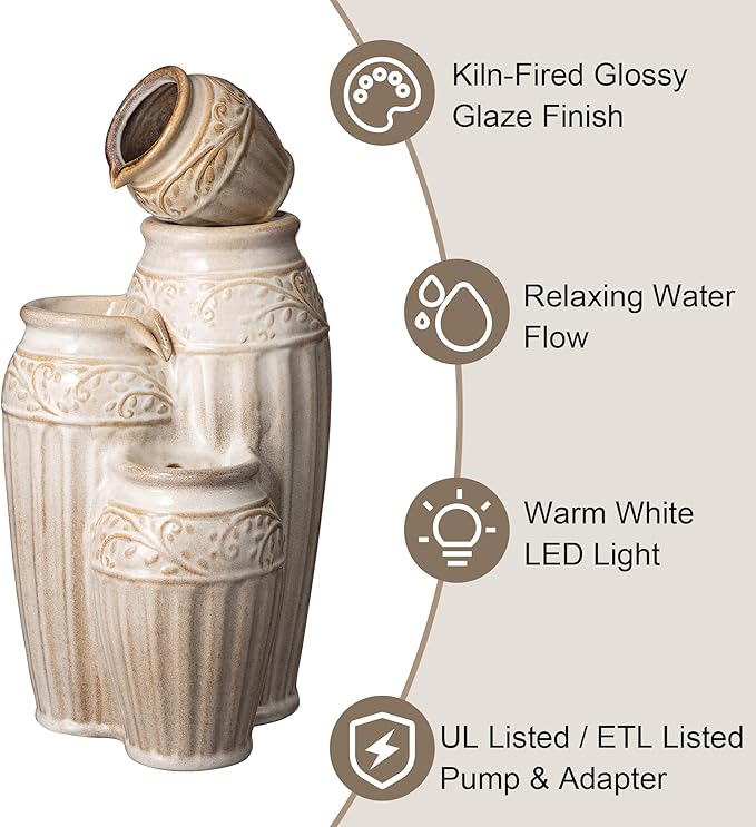 • Classic Design: Featured with Classical and timeless clay pots design with delicate embossed texture. There is warm white LED lights for the 2 lower pots, the trickling water rippled and sparkled in the warm. Elegant and charming kiln-fired sand beige glaze finish. With an antique look, the fountain brings a touch of natural beauty, the soft sound of cascading water is sure to make you relax and makes a soothing rest for you in the garden