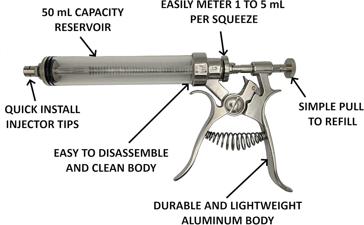 • Professional pistol grip meat injector syringe kit features an aluminum body, clear plastic syringe, four stainless steel needles, cleaning brushes, storage carry case and adjustable injection dose