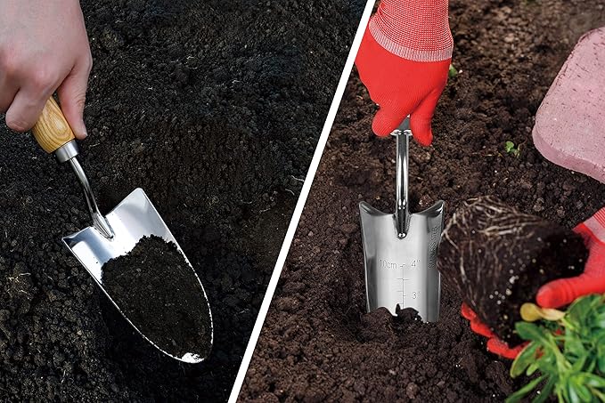 • 🍓Great Value with Original Design🥬 -- 5 Pcs Set Including Original Design Depth Mark 'T' Shape Dibber, Original Design '5-in-1" Weeding Trowel Fork, and 3 Pcs More Popular Large Trowel+Transplant Trowel+Cultivator, Suitable for All Major Gardening Tasks Such as Seeding, Transplanting, Digging, Weeding, Loosening Soil, Cutting, etc.