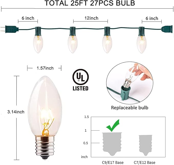 • [Easy to Install] Each C9 Christmas bulb is 3.14 inches high and 1.18 inches wide. 6-inch lead with male plug, 12-inch bulb spacing, 6-inch tail with female connector. The bulb has a C9/E17 candlestick socket base that can be connected end-to-end.