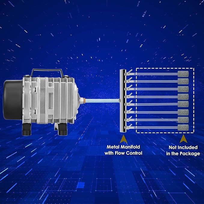 • ACCESSORIES – A short piece of hose and a 8-outlet volume adjustable metal manifold are included in the package of this pond aerator to facilitate the application. Users only need to buy 3/16” standard airline tubing and air stones to start the operation.