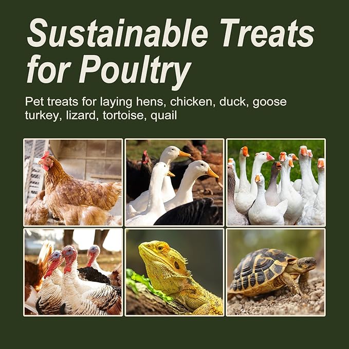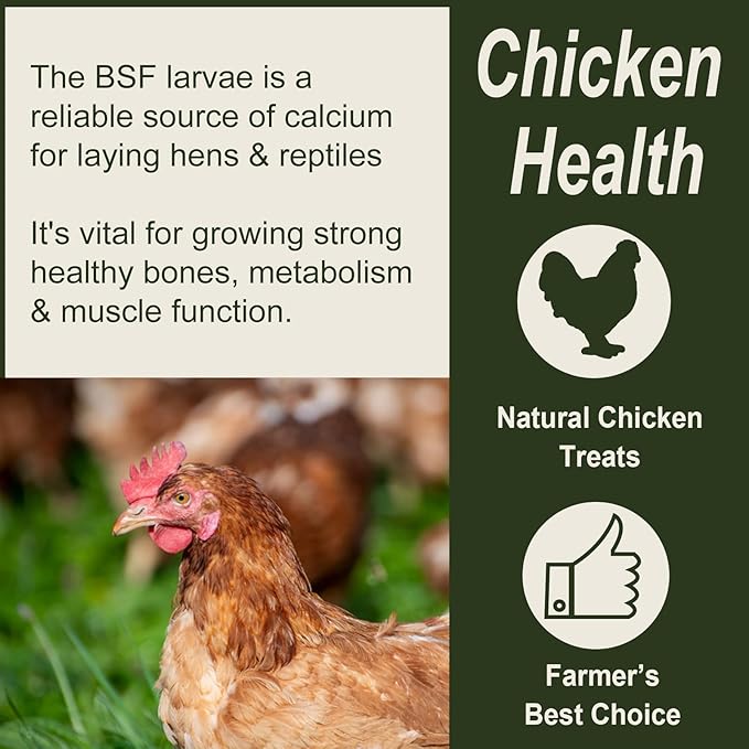 • PACKED FULL OF ENERGY: When you chickens eat the larva, they're getting the benefit of all that energy. Black Soldier Fly larvae make a great staple food or treat for chickens and many reptiles, like bearded dragons, leopard geckos, poison dart frogs, crested geckos, day geckos, and turtles etc.