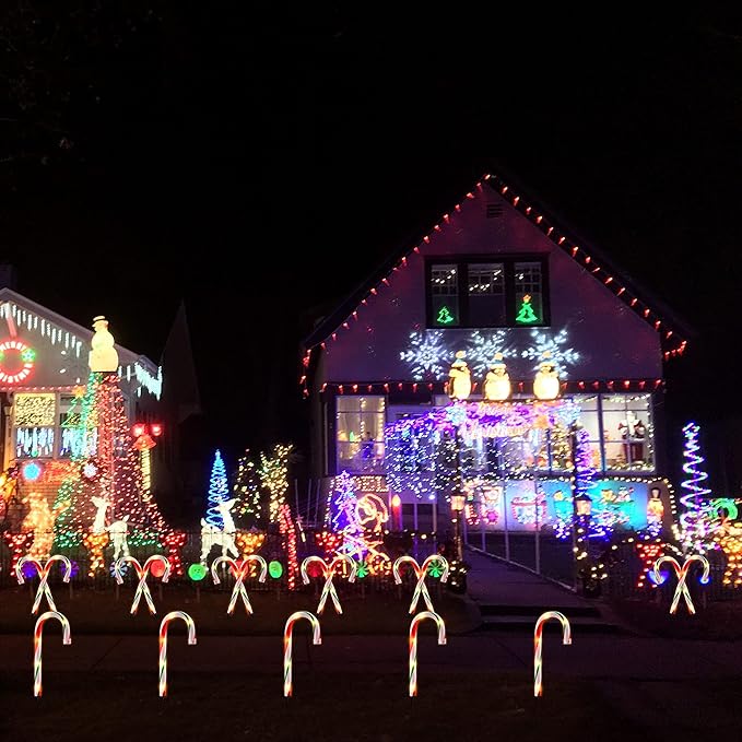 • 【Easy to Install】These Christmas outdoor candy cane lights come with 10 ground stakes. Just insert the stake into the candy cane, then press the stakes into the ground.