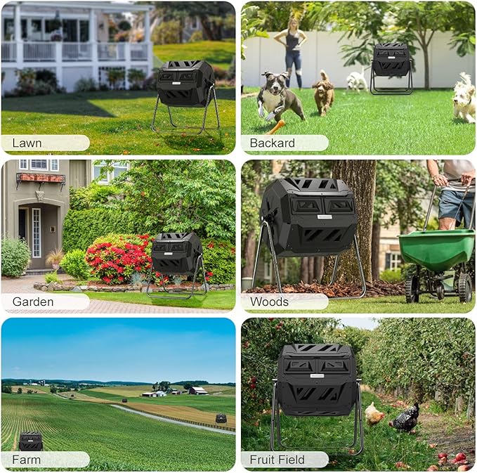 • ✅Easy to Access Finished Compost: Just Slide the door open and take the organic fertilizer out when the compost is ready. When a check reveals the compost is complete —and this can happen in a matter of weeks —the same access that allowed you to fill the tumbler lets you empty it. Now is the time to spread the results.