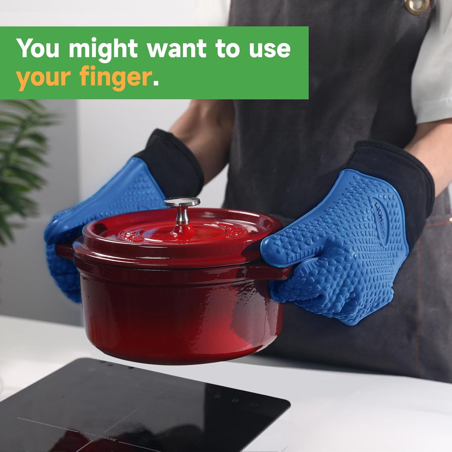 • Unrivaled Heat Defense for Ultimate Safety: Engineered with heat-resistant silicone up to 446°F, our oven mitts protect hands from scorching grill surfaces, boiling pots, and oven racks while maintaining flexibility to flip burgers or adjust smoker vents effortlessly; The 13.7" extended length with 3.17” sleeve shields wrists during outdoor barbecue adventures