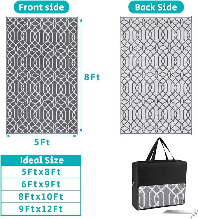 • Versatile Outdoor Carpet: The indoor outdoor plastic rugs have multiple choice in different colors(4'x6',5'x8',6'x9',8'x10',9'x12',9'x18',8'round), is ideal for a variety of indoor outdoor activities,like patio mat, deck rug, garden rug, beach mat, picnic mat, BBQ party mat, rv camping rug,pool rug,outdoor doormat,garage rug,front door mat,allowing you to have plenty of imaginable space for more fun.