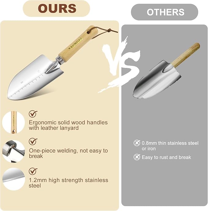 • Durable Stainless Steel Garden Tools - Heavy-duty stainless steel heads can withstand the toughest roots, rocks, and soil, sturdier than cast aluminum/coated/carbon steel, No need to worry about rusting and breaking during pruning, digging, weeding, etc. Mirror-polished process to make the tool get the minimal soil adhesion and easier cleaning.
