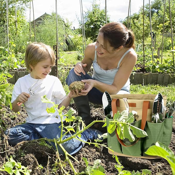 • Cover All You Need - 10 pieces garden tool kit has a handy tote bag, pruning shear, garden trowel, transplanter, weeder, hand fork, hand rake, kneeling pad, sprayer, garden gloves. All the gardening supplies are made of safe, non-toxic and harmless materials.