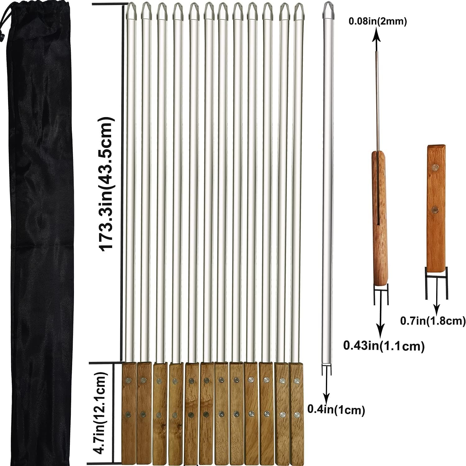 • Premium Materials- Made of stainless steel 430, 0.4 Inch Wide, 22 Inch Long with real Wood handle. Stainless Steel Thickness: 2mm. This thing is made out of quality material, you can almost use it as SWORD ! 12 Pack, each skewer tip has a silicone cap protector.