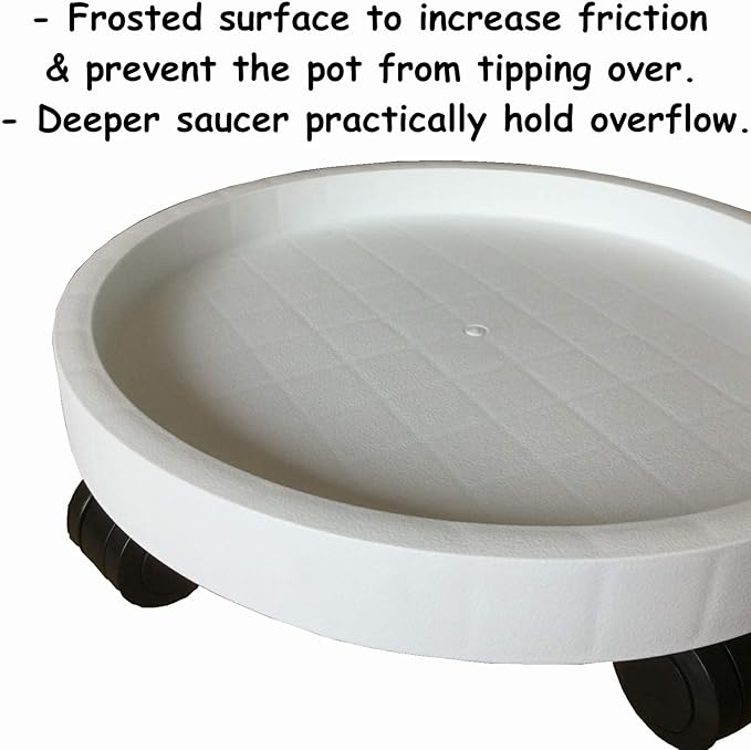 • [4 Universal Silent Wheels] 1. All use silent wheels, so no noise is generated even when moving on hard surfaces. 2. The wheels use thickened internal structure and outer shell, which is the trick to more wear resistance and bear more weight. 3. Wheels are already machine-mounted on saucers and do not require assembly. 4. All four extra-sturdy casters rotate fully, so you can swivel the plant around in its current location or move it along smoothly.