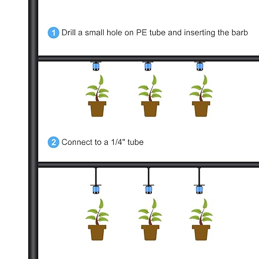 • Can be connected to a 1/4" tube, or drilling a small hole on PE tube and inserting the dripper, easy installation.