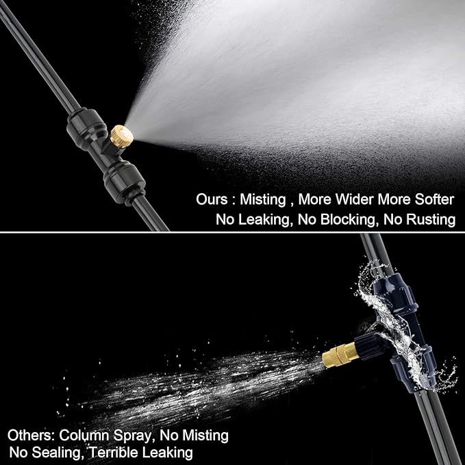 • 【Wide Use Range】Water mist cooling system can widely use for trampoline ,patio,fan, garden,vegetable house,landscaping,humifidication ,greenhouse and so on .Watering by misting system , it can cover more large area than the traditional watering ,increasing humidity effectively and reducing dust particles ,which will make you and your plants feel more better.