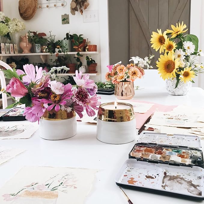 • QUALITY CONTAINER: Featuring a hand-made Gold/White Ceramic design, the 10oz (295ml) Clara container brings style and function to your home; infuse your space with eucalyptus candles with clearance, then reuse the pot to grow wildflowers after the wax is gone