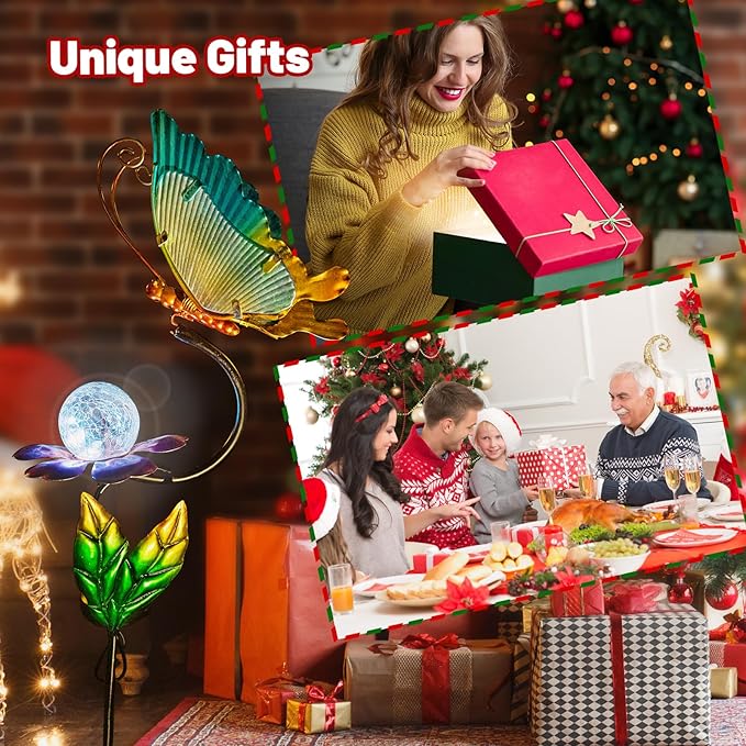 • 【Vibrant Butterfly Decoration】-Features metal&glass vivid butterfly sculpture,flowers with glass crackle ball and metal leaves.Hand painted crafts build a cute natural landscape decoration for you,take a moment to enjoy the garden decor