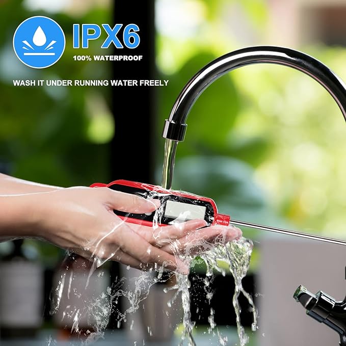 • WATERPROOF & LONG PROBE - Cooking thermometer with IPX6 rated waterproof, clean it freely under running water. Keep you away from hot food safely with 5.1 inch food grade long probe, pocket sleeve clip included