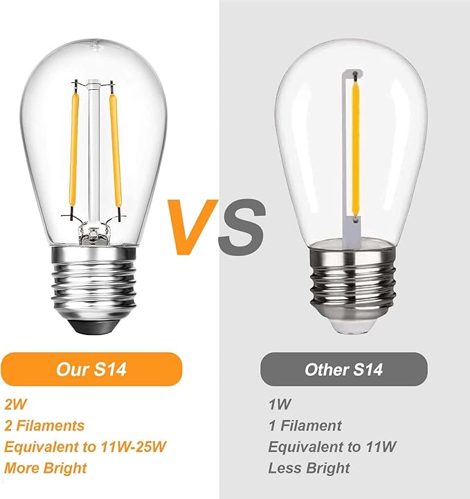 • 💡【Energy Efficient】For a 100ft patio string light with 30 bulbs, using 30 old 11-watt incandescent bulbs will cost 330 watts per hour. However, 30 2-watt S14 LED bulbs only cost 60 watts per hour, which is 82% more energy efficient than traditional bulbs.Furthermore, this E26 2W S14 replacement bulb is brighter than the old 11W incandescent bulb.