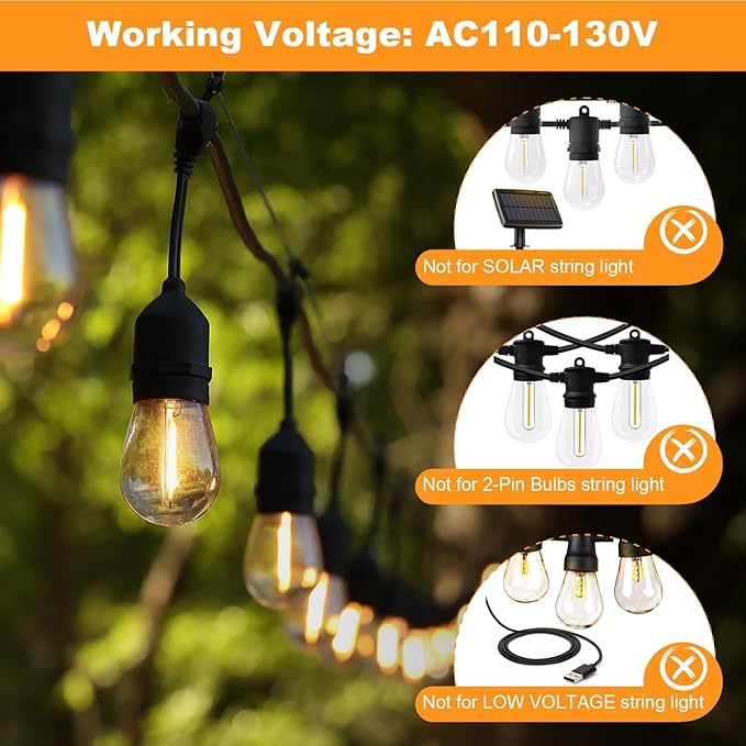 • ⚠️Voltage: Works with 110V-130V only (⚠️ Not for low-voltage solar string lights like 3V/6V).