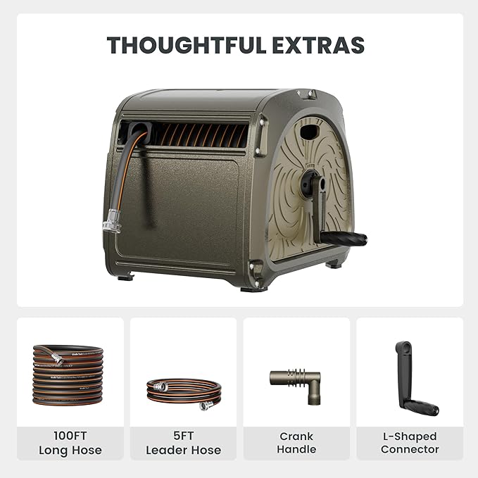 • COVER EVERY CORNER: The heavy-duty hose reel is pre-installed with a 5/8'' 100 ft hybrid hose, which can cover every corner of your garden and complete daily cleanings and waterings.