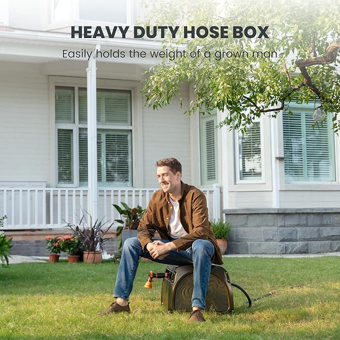 • STURDY & DURABLE: The hose reel box is coated with anti-rust material, which can stand firmly under extreme weather. The Aluminum connections guaranteed no leakage, and the heavy metal shell will make it stands firmly when used.