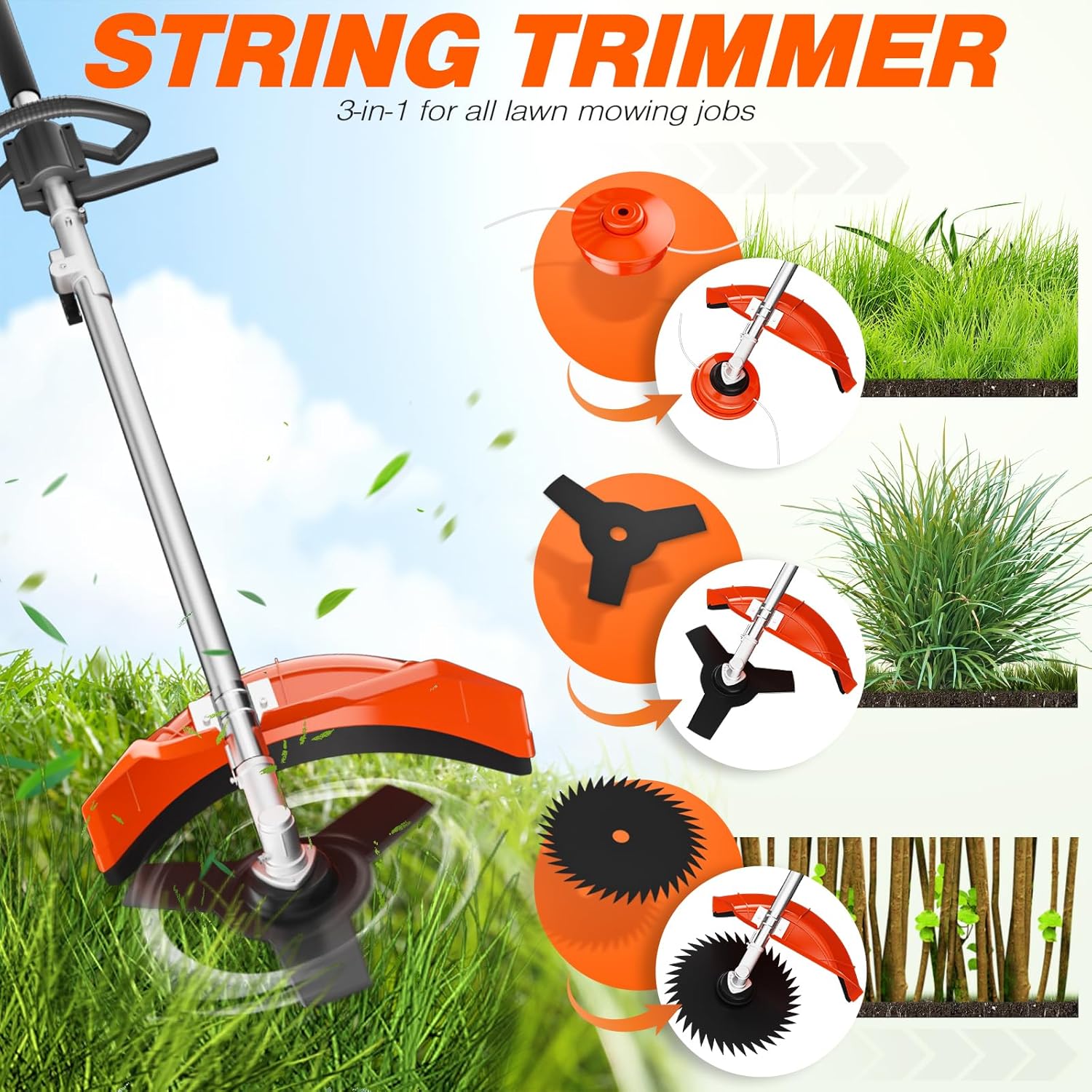 • Assemble the attachments,you will get 1 x brush cutter;1 x grass cutter (with four mowing heads);1 x chainsaw.With 1 extension pole,which create diversity when tackling the outdoor yard garenden job.